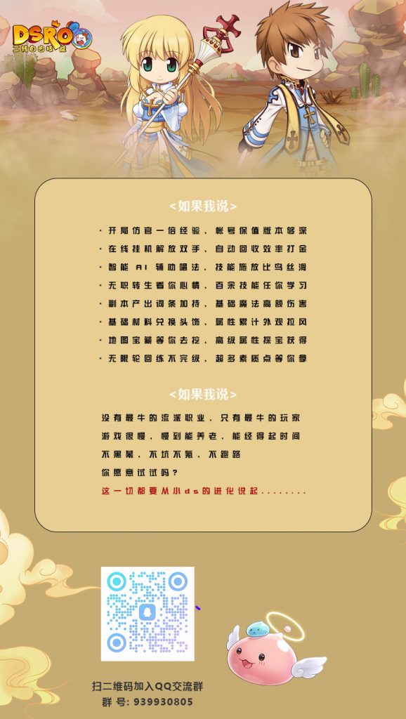 小G自我陈述:服务器版本深度足够玩半年起步照着1年去搞,不是烟花服,前期迭代内容很久,通过自己对RO的理解克服困难进行开荒是我做这个服务器的宗旨,如果你想上来就爽,我建议321搜所超变随便找一个就玩,打了初级道场,去中级,然后高级道场,爽一下就行。我这里是想给大家做不一样的内容体验。这是我做的第二款,第一款已经稳定运营1年半,也不是跑路服,游戏内做了很多新奇的设定,需要大家在群中交流,有交流才有乐趣,玩游戏是玩游戏社交吹水才是RO的核心本质,总之新手补助多多,这一次来这养老吧!